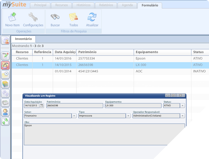 É possível criar formulários personalizados para os recursos internos do sistema, que estarão visíveis somente para o operador.